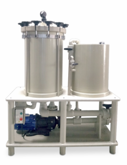 化學鎳過濾機用過濾介質把容器分隔為上、下腔即構成簡單的過濾器。懸浮液加入上腔,在壓力作用下通過過濾介質進入下腔成為濾液,固體顆粒被截留在過濾介質表面形成濾渣(或稱濾餅)。過濾機在過濾過程中過濾介質表面積存的濾渣層逐漸加厚,液體通過濾渣層的阻力隨之增高,過濾速度減小。當化學鎳過濾機的濾室充滿濾渣或過濾速度太小時,停止過濾,清除濾渣,使過濾介質再生,以完成一次過濾循環。