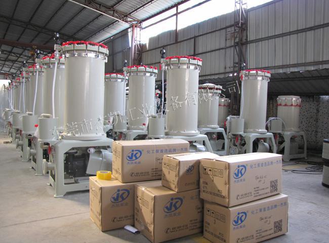 過濾機按其適用的工藝過程和處理功能可分為鍍前溶液除油過濾機和(化學鍍)電鍍過濾機兩大類。過濾機按其配置的防腐蝕泵的類型可分為磁力泵和機械泵形式,磁力泵適用于固體懸浮物較少且沒有鐵磁金屬微粒的溶液連續過濾,其優點是只要塑料隔離套不破壞就無泄漏可能。