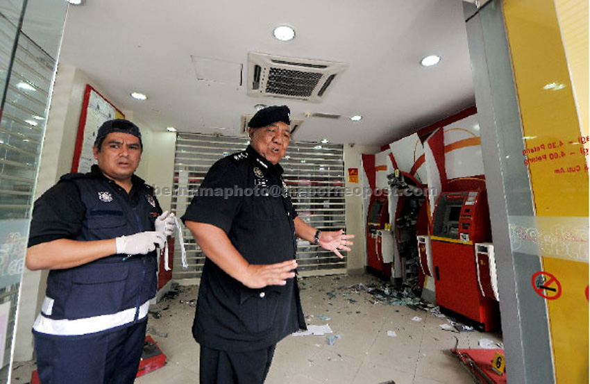 馬來西亞在當地時間13日凌晨2時許,約四名匪徒乘坐一輛豪華汽車抵達馬六甲一家銀行現場,將兩枚土制炸彈放在愛極樂高原大馬銀行電子銀行室內,其中一顆炸彈炸開提款機,雖然一地都是鈔票,但只抓了一把鈔票就逃。盜走一筆數額未明的款項。