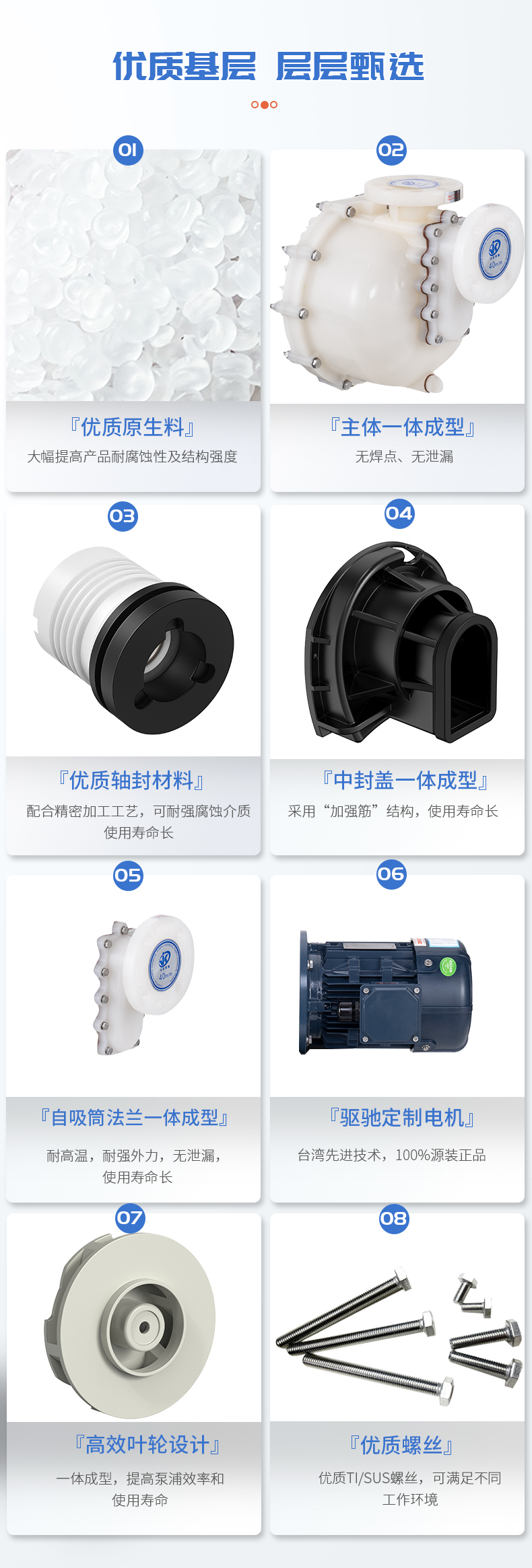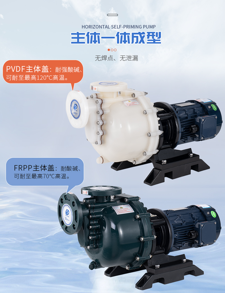 1、泵體采用優(yōu)質(zhì)原生料,大幅提高產(chǎn)品耐腐蝕性及結(jié)構(gòu)強(qiáng)度; 2、自吸筒與法蘭一體成型,無焊點,無泄漏; 3、中封蓋一體成型,采用強(qiáng)筋穩(wěn)固,使用壽命長; 4、高效葉輪設(shè)計,一體成型,提高泵浦效率和使用壽命; 5、軸封材質(zhì)可配合使用環(huán)境選擇不同材質(zhì)。