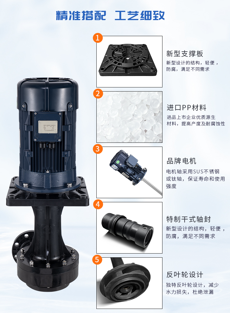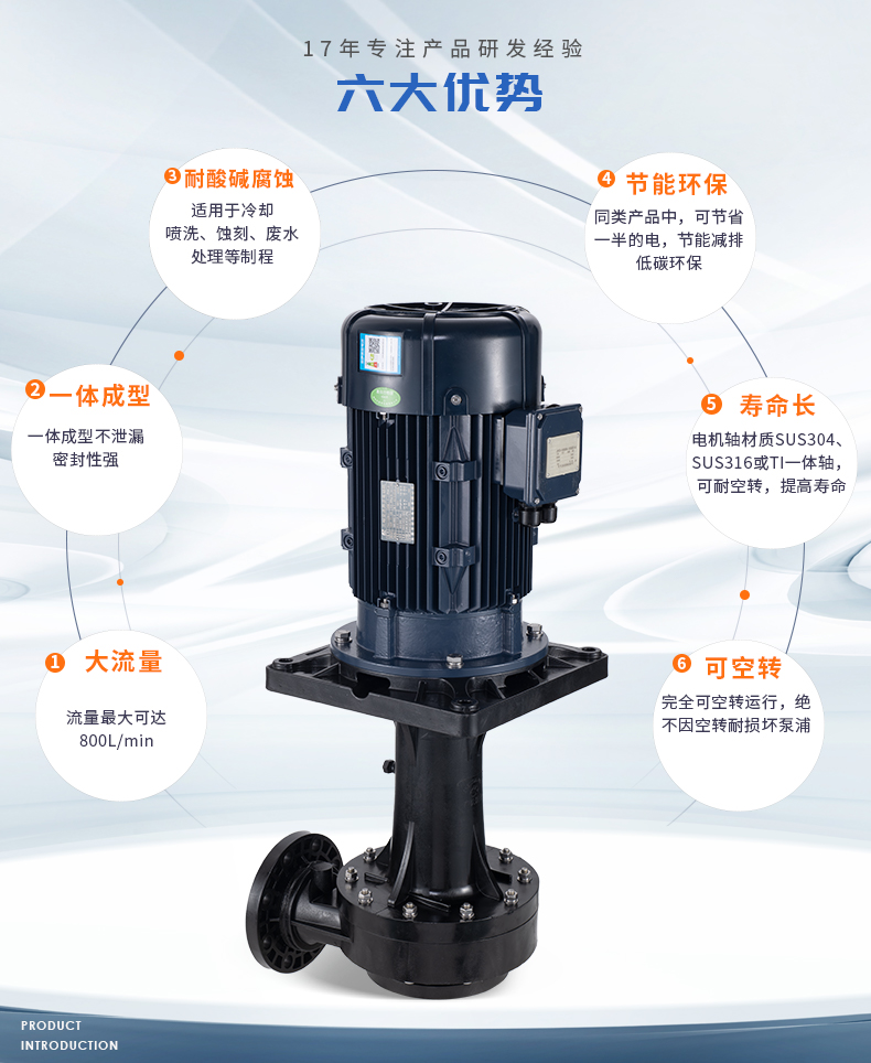 1、采用進口/上市企業優質原生料,大幅提高產品強度及耐腐蝕性; 2、特制的桿式軸封,配合SUS金屬或TI金屬一體軸,可耐空轉、防腐蝕,提高電機壽命; 3、創新型葉輪設計,一體成型工藝,效率高、性能穩定、壽命長; 4、獨特的反葉輪設計,減少水力損失,杜絕泄漏; 5、完全可空轉運行,絕不因空轉而損壞泵浦; 6、適合各種酸堿液體循環,適用于冷卻、噴洗、蝕刻、廢水處理等制程。