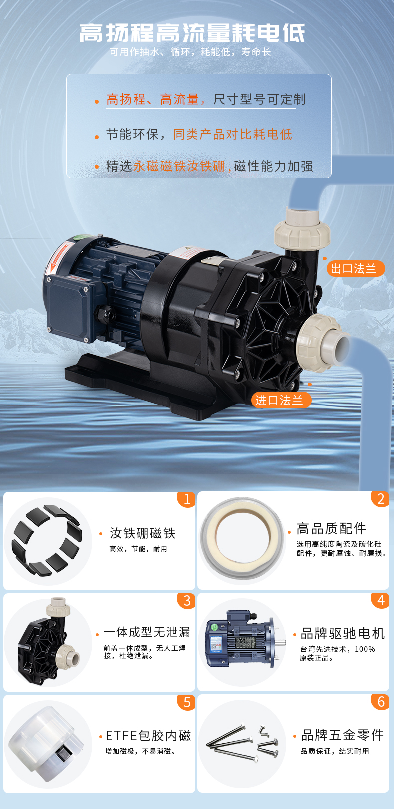 1、泵浦采用優質CFRPP/PVDF/ETFE原生材料; 2、高純度陶瓷及碳化硅軸承、軸芯; 3、耐腐蝕、耐磨損、耐熱沖擊; 4、超大流量,流量可達1100L/MIN; 適用于:蝕刻液、電鍍液、電泳液、污水提升、輸送、噴淋等。