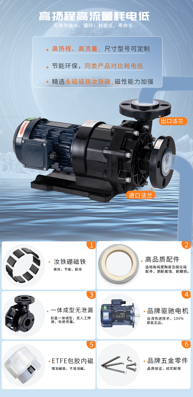 1、泵浦采用優質CFRPP/PVDF/ETFE原生材料; 2、高純度陶瓷及碳化硅軸承、軸芯; 3、耐腐蝕、耐磨損、耐熱沖擊; 4、超大流量,流量可達1100L/MIN; 適用于:蝕刻液、電鍍液、電泳液、污水提升、輸送、噴淋等。