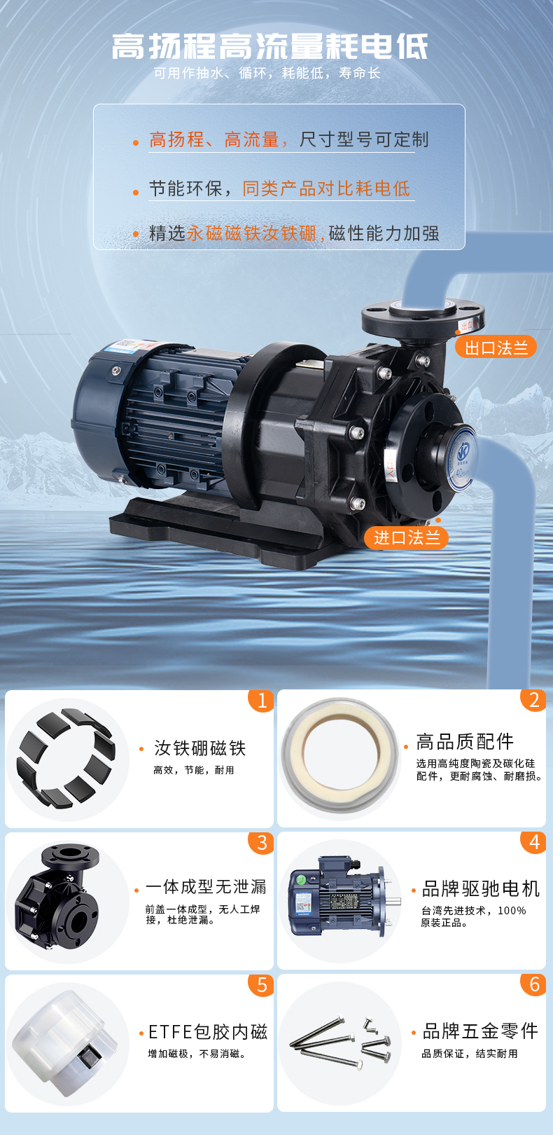 1、泵浦采用優質CFRPP/PVDF/ETFE原生材料; 2、高純度陶瓷及碳化硅軸承、軸芯; 3、耐腐蝕、耐磨損、耐熱沖擊; 4、超大流量,流量可達1100L/MIN; 適用于:蝕刻液、電鍍液、電泳液、污水提升、輸送、噴淋等。