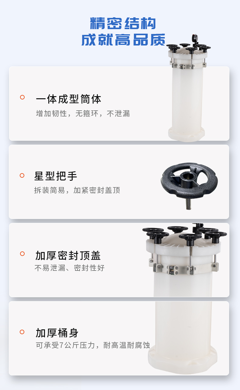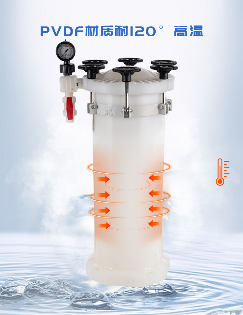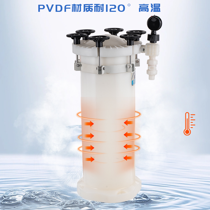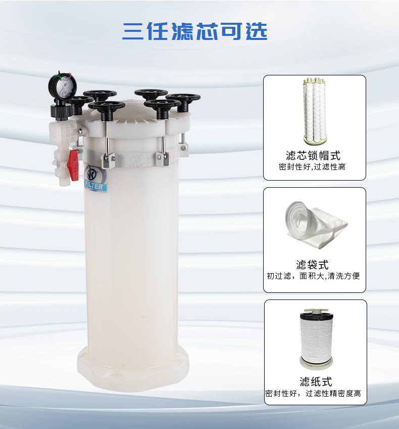 1、PPH/PVDF 原生材料,多種濾材可選; 2、桶身排氣,無金屬扣環(huán)+翻蓋設計; 3、加厚桶一體成型設計,整機無焊接點,100%無泄漏,結(jié)實、安全。使用壽命可達8-10 年; 4、配套多種款式濾材,滿足市場多種需求; 5、廣泛用于酸堿藥水,電鍍藥水,蝕刻液,清洗液過濾。