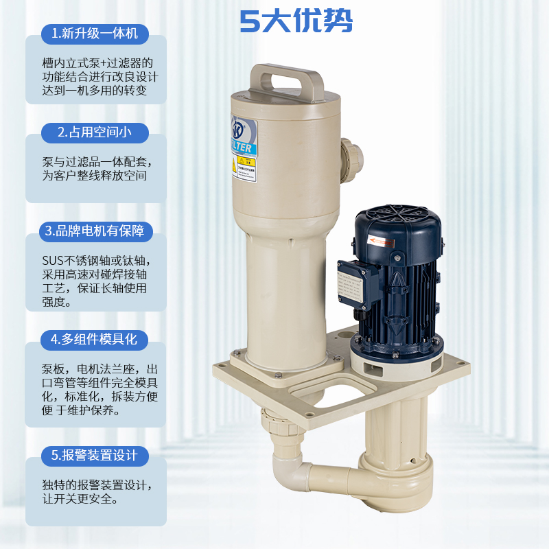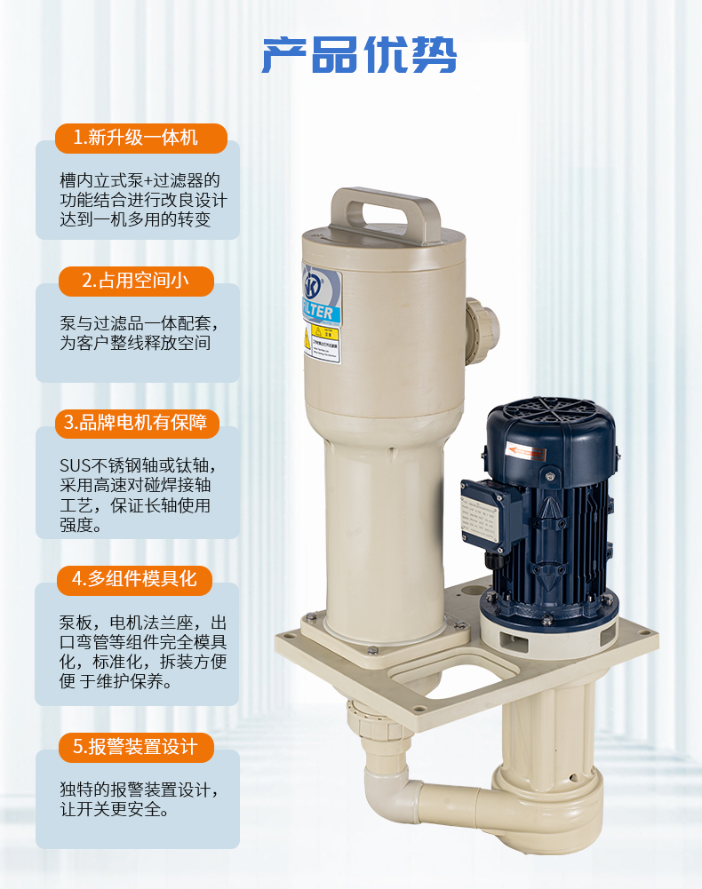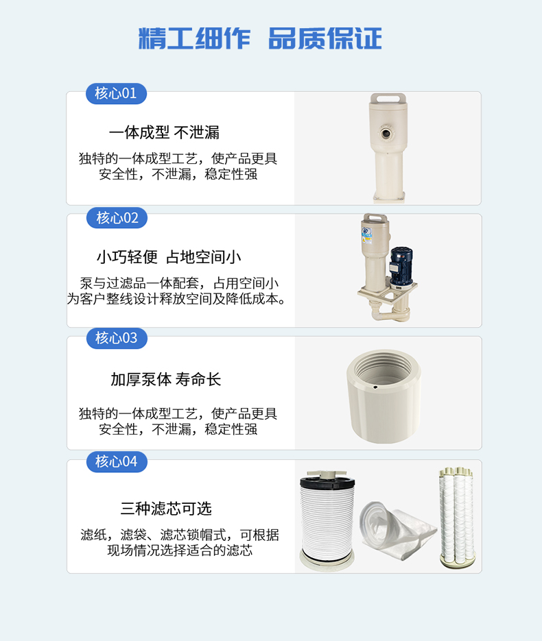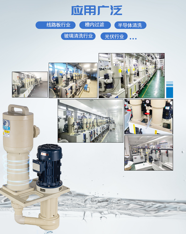 1、采用優質PPH/PVDF優質原材料,提升耐腐蝕能性及結構強度; 2、泵與過濾器一體配套,緊湊,占用空間小,為客戶整線設計釋放空間及降低成本; 3、槽內安裝,可配套濾芯,濾袋,網板多種方式,適用于噴淋、循環等制程; 4、更換濾芯快捷、省時,省力; 5、獨特的報警裝置設計,開蓋更安全。